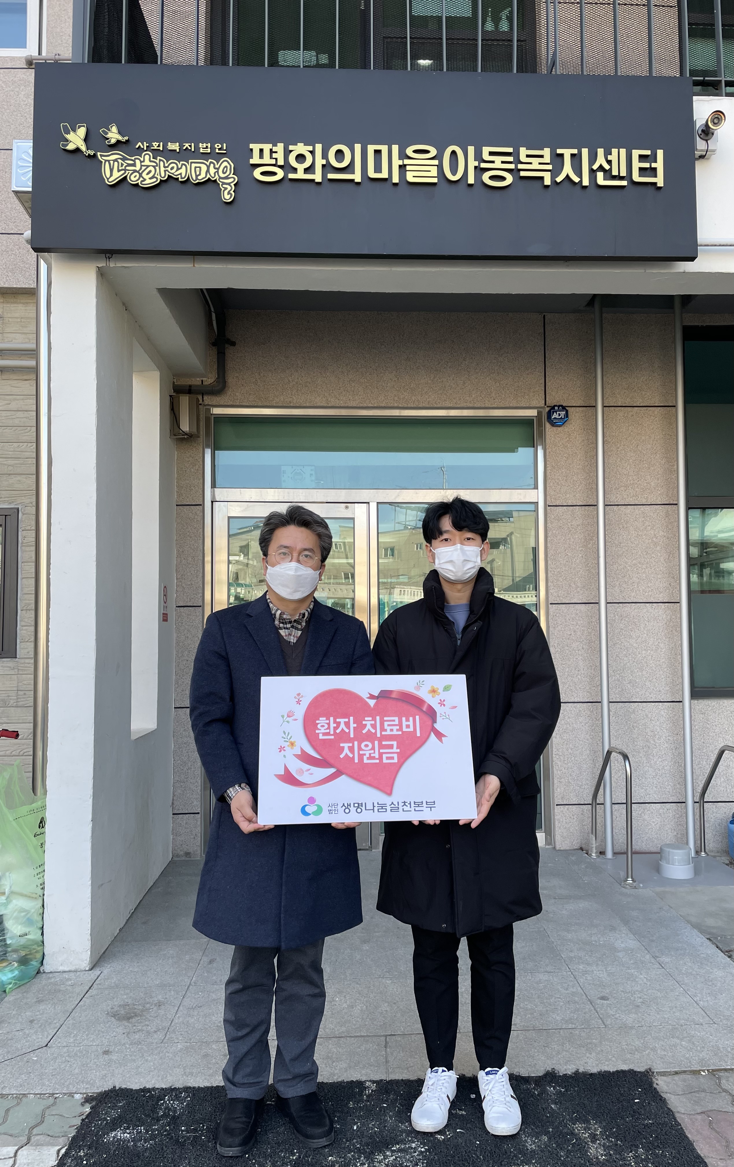 1월 13일, 사회복지법인 평화의 마을 아동복지센터에 방문하여 1월 환자치료비지원금 전달식을 진행.