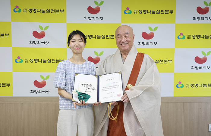 전달식은 환자의 전담 사회복지사와 생명나눔실천본부 이사장 일면 스님이 함께한 가운데 본부에서 진행되었습니다.