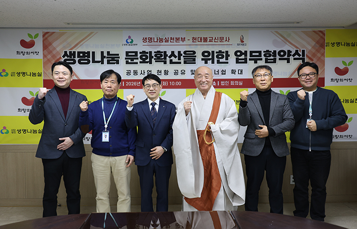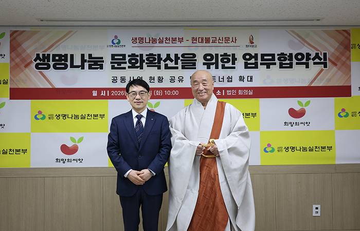 생명나눔실천본부(이사장 일면 대종사)와 현대불교신문(대표 한명우)은 2월 10일, 법인 회의실에서 공동사업 협업 및 파트너십 확대를 위한 업무협약을 진행하였습니다.
